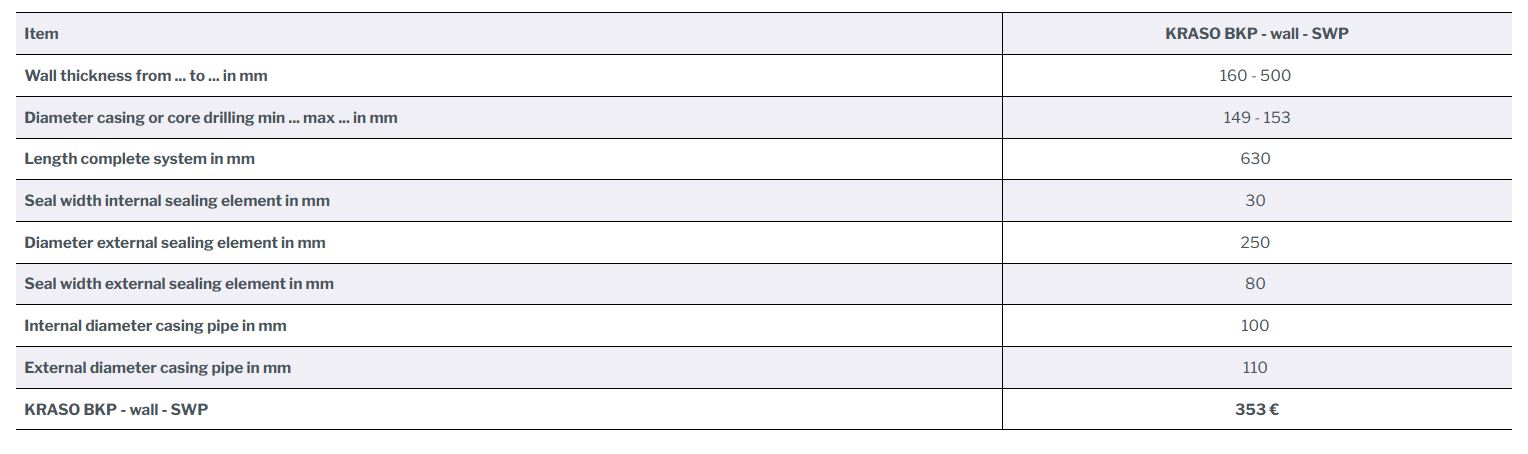 single utility connection for supply lines (gas, water, electricity or telecommunication) for buildings with basement, incl. extension set | DafStB waterproof concrete guideline: stress class 1 + 2, DIN 18533 W1 -E and W2.1 -EConvenient, safe, tight connection to the network - gas, water, electricity or telecommunication+ Simple and safe single utility connection for new buildings or rehabilitation for buildings with basement+ Flexible installation: gas, water, electricity or telecommunication - including installation/mounting set+ Double installation possible: electricity and telecommunication!+ DVGW-certified according to VP 601: complete system is gas- and water pressure tight up to 1 bar!+ For core drilling and casing DN 100 (99 - 103 mm). For precast walls and in-situ concrete walls!+ For wall thicknesses from 160 - 500 mm+ Tight in waterproof concrete structures with stress class 1 (permanently or temporarily pressing water)+ External sealing element with sealing flange according to DIN 18533! Seal width: 80 mm+ Radon tightness IAF tested - according to FHRK leaflet MB 101! Resistant to methane gas!+ Gas and odour-tight - high-quality in terms of TA-Air!+ Split end plugs for easy installation!+ Including extension set