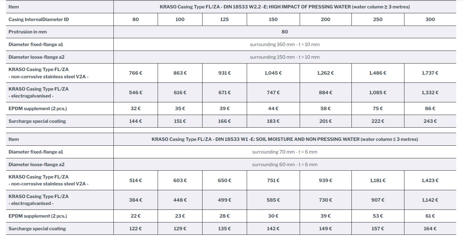 KRASO Casing Type FL/ZA - DIN 18533 W2.2 -E: HIGH IMPACT OF PRESSING WATER (water column ≥ 3 metres) |