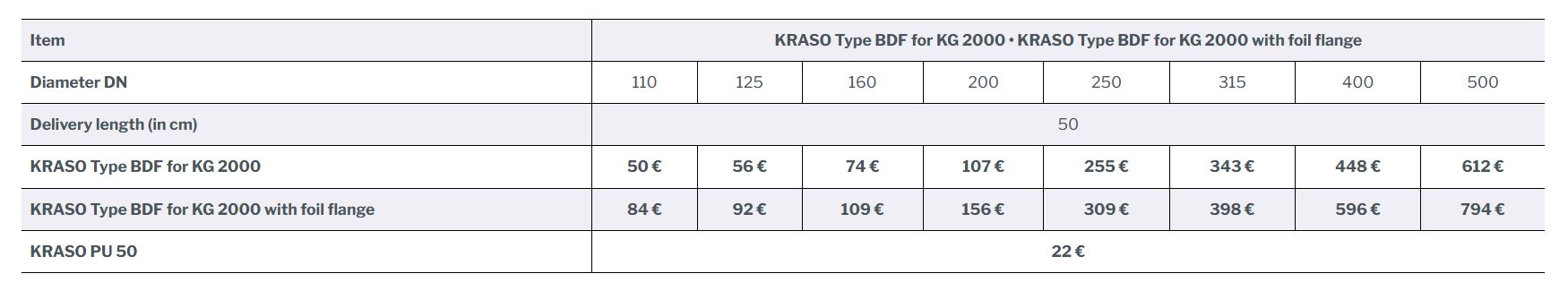 for the connection to system KG 2000 lines, also available with KRASO Foil Flange, oil- and bitumen resistant, surrounding approx. 15 cm. For the integration of the foil flange we recommend our adhesive and sealant KRASO PU 50 | DafStB waterproof concrete guideline: stress class 1 + 2, with foil flange DIN 18533 W1 -E