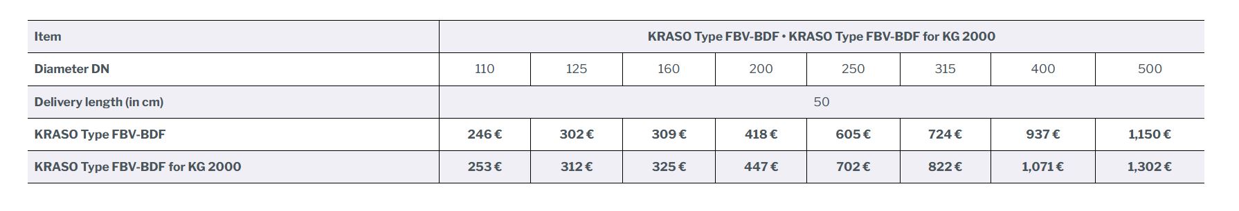 Die Bodendurchführung verfügt über eine einseitig angeformte Steckmuffe zum Anschluss von KG-/HT- oder KG-2000-Rohren (KRASO Typ FBV-BDF für KG 2000). Es sind verschiedene Durchmesser von DN 110 bis DN 500 erhältlich.