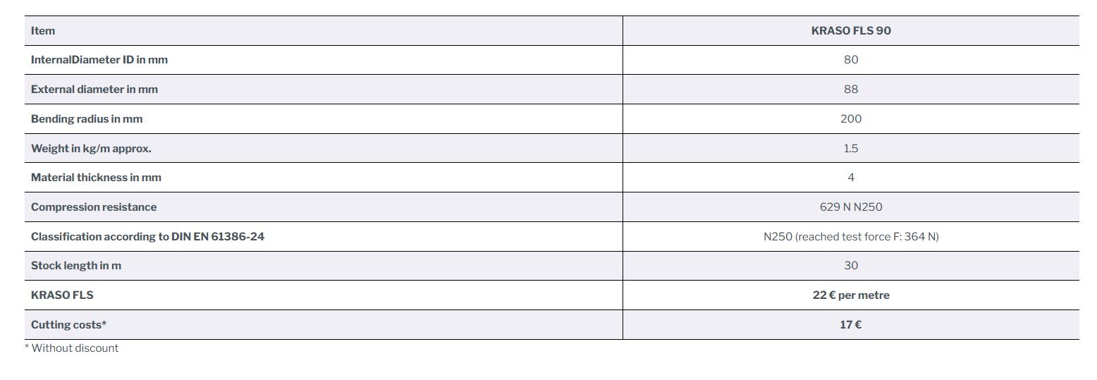 flexible empty pipe system as a cable protective hose for the extension of the KRASO Builder's Convenience Box - floor - SET using the KRASO BKP - Extension Set, with a smooth interior for easy cable pulling, smooth exterior for optimal sealing, flexible, increased pressure and vacuum resistance, high axial resistance, resistant to alkalis and acids, resistant to brine and sea water, good UV and ozone resistance, gas-tight and liquid-tight, RoHS-compliant (Restriction of Hazardous Substances), compression resistance 629 N, tests in line with DIN EN 61386-24 lead to the following classifications: type 250 - impact resistance: normal - classification code: N250
