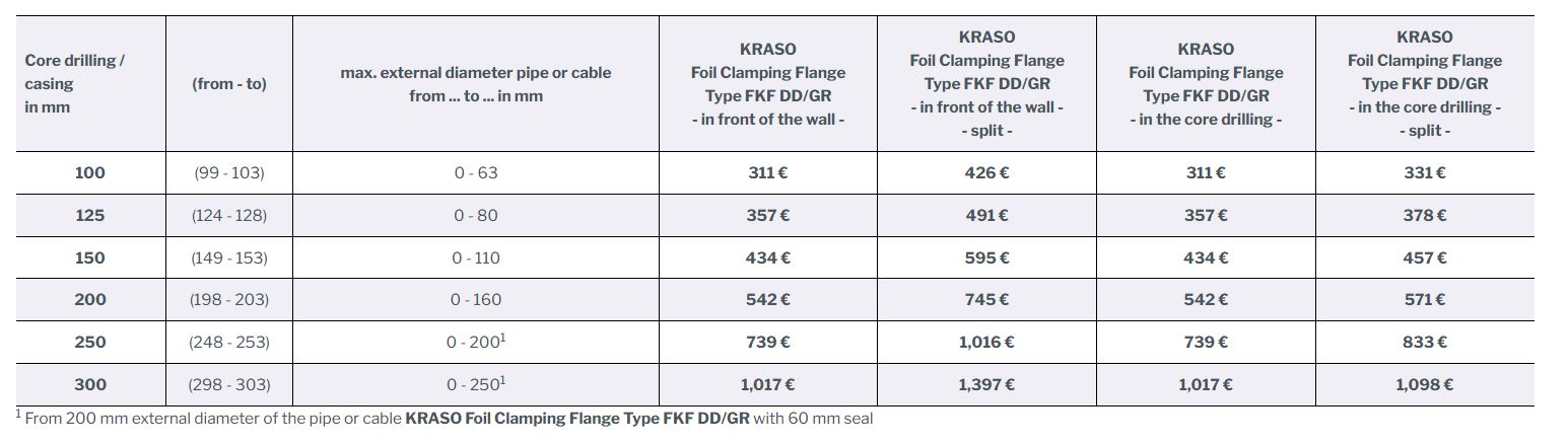 1 From 200 mm external diameter of the pipe or cable KRASO Foil Clamping Flange Type FKF DD/GR with 60 mm seal
