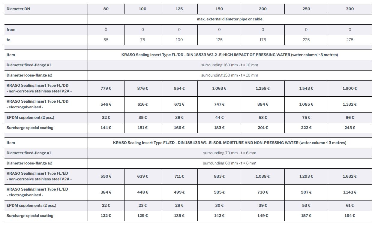 KRASO Sealing Insert Type FL/ED - DIN 185433 W1 -E: SOIL MOISTURE AND NON-PRESSING WATER (water column ≤ 3 metres)