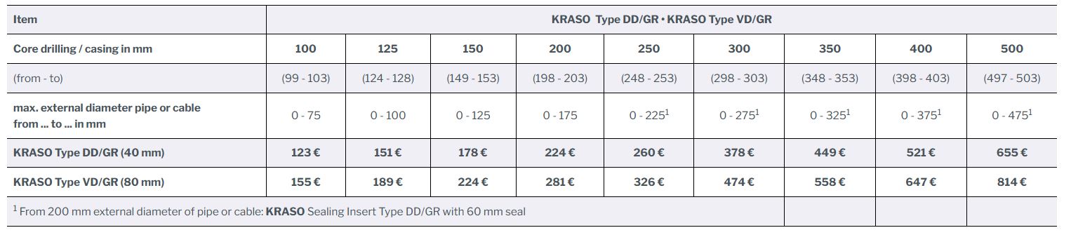 1 From 200 mm external diameter of pipe or cable: KRASO Sealing Insert Type DD/GR with 60 mm seal |