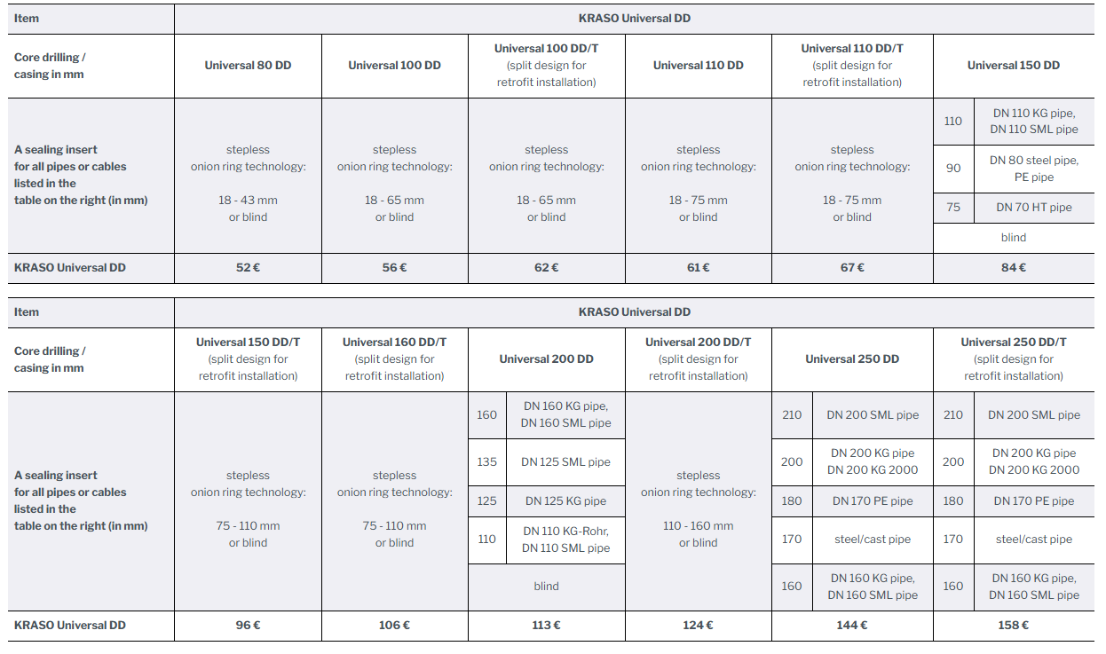 for installation of pipes or cables, double sealing against pressing water up to 3 bar. Can also be used as blind plug for feed-through of pipes or cables (except KRASO Universal 250 DD and Universal 250 DD/T) | DafStB waterproof concrete guideline: stress class 1 + 2
