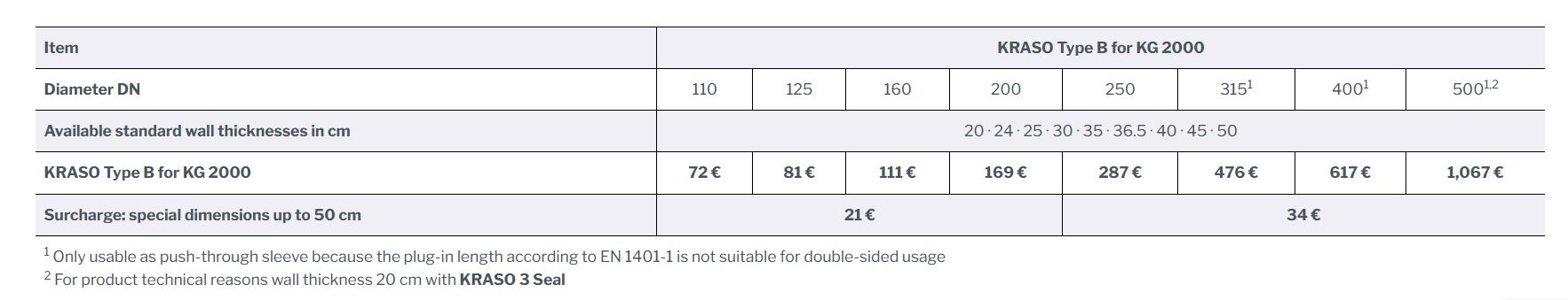in accordance with DIN EN 1401, for installation in waterproof concrete walls, for connection to KG/HT pipes on both sides (Uni B) or for KG/HT pipes to be pushed through (Uni D), with water pressure tight surrounding KRASO 4 Seal, with markings for a simple shortening on-site to standard wall thicknesses | DafStB waterproof concrete guideline: stress class 1 + 2The proven wall penetration made of solid wall material+ KRASO 4 Seal - MPA-tested up to 10 bar!+ IAF-tested: radon tight! + Dimensionally and pressure resistant solid wall material: low abrasion, easy installation at low temperatures + In accordance with DIN EN 1401 (KG)+ KRASO Type Universal B: with formed plug-in sleeve on both sides for the connection of KG/HT pipes on both sides+ KRASO Type Universal D: with integrated push-through sleeve+ Markings for a simple shortening on-site to standard wall thicknesses + Including two KRASO Covers as installation aid + DafStB waterproof concrete guideline: stress class 1 + 2