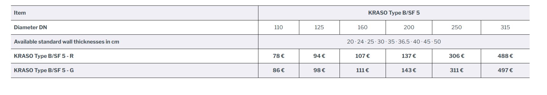 Standardmäßig ist die KRASO Wanddurchführung Typ B/SF 5 für Wandstärken von 20 bis 50 cm erhältlich (u. a. 20, 24, 25, 30, 35, 36,5, 40, 45 und 50 cm).
