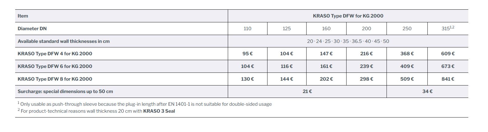 1 Only usable as push-through sleeve because the plug-in length after EN 1401-1 is not suitable for double-sided usage 2 For product-technical reasons wall thickness 20 cm with KRASO 3 Seal |