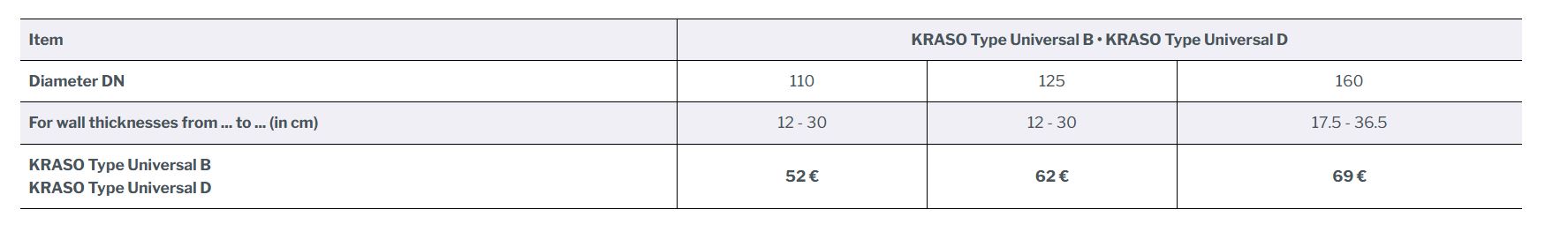 Die KRASO Wanddurchführung Typ Universal ist in den Nennweiten DN 110, DN 125 und DN 160 erhältlich. Abweichende Durchmesser sind auf Anfrage möglich.
