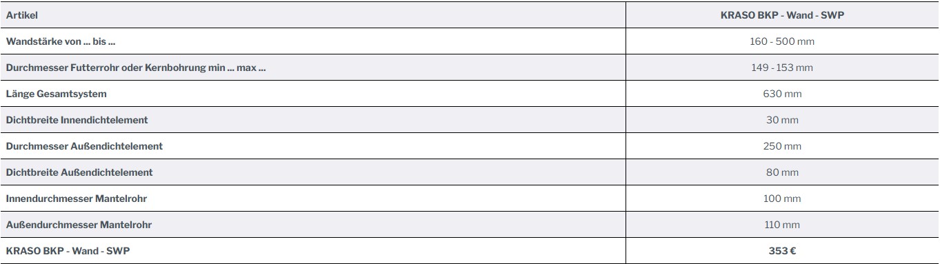 + Für Kernbohrung und Futterrohr DN 150 (149 - 153 mm). Für Fertigteilwände, Ortbetonwände und Mauerwerk. Für Wandstärken von 160 – 500 mm