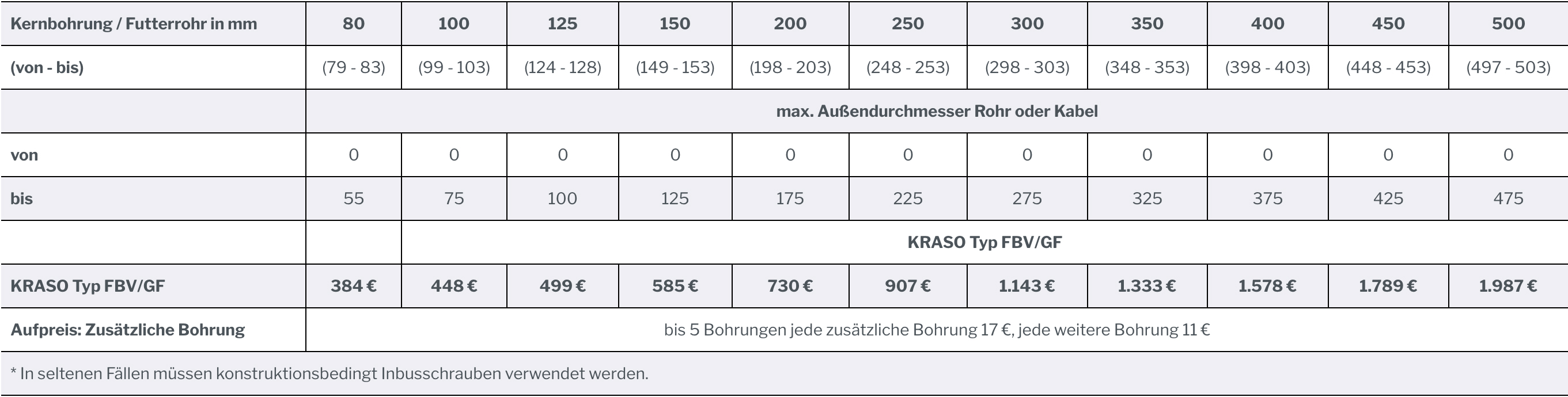 Kernbohrung / Futterrohr in mm |