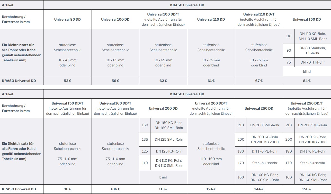 zur Durchführung von Kabeln und Rohren, doppelt dichtend gegen drückendes Wasser bis 3 bar, auch als Blindverschluss bis zur Durchführung von Rohren und Kabeln einsetzbar (außer KRASO Universal 250 DD und Universal 250 DD/T) | WU-Richtlinie: Beanspruchungsklasse 1 + 2