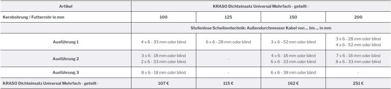 Der KRASO Dichteinsatz Universal Mehrfach - geteilt - ist für Kernbohrungen bzw. Futterrohre mit 100, 125, 150 und 200 mm Durchmesser erhältlich – jeweils in unterschiedlichen Ausführungen für mehrere Kabeldurchführungen.