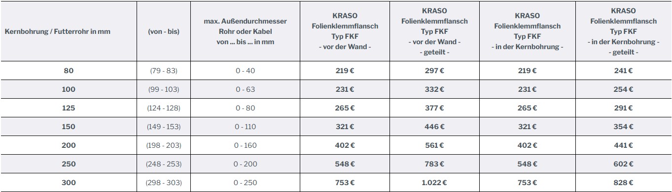 + Innovativ: Mit dem KRASO Folienklemmflansch Typ FKF kann an jedem Rohr oder Kabel, welches glatt und stabil ist, ein Folienflansch druckwasserdicht befestigt werden!