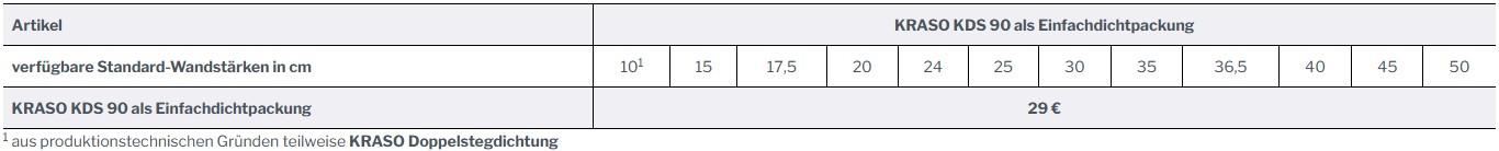 Die KRASO KDS 90 ist für folgende Standard-Wandstärken erhältlich (in cm):