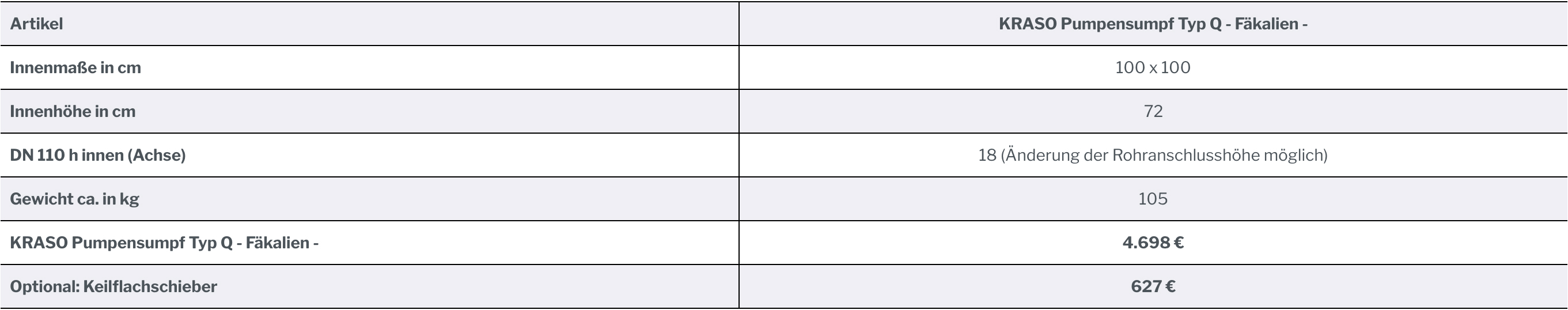 Im Lieferumfang enthalten ist der KRASO Pumpensumpf Typ Q - Fäkalien - inklusive Hebeanlage. Optional erhältlich sind ein Keilflachschieber sowie eine KRASO Pumpensumpf-Abdeckung 100/100.