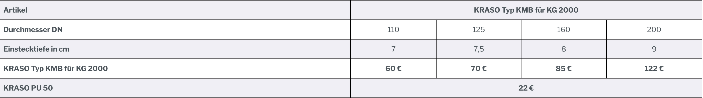 Der KRASO Typ KMB für KG 2000 ist standardmäßig in folgenden DN-Größen verfügbar: