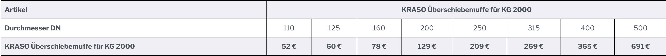 Die Überschiebemuffe für KG 2000 ist in den Durchmessern DN 110, 125, 160, 200, 250, 315, 400 und 500 verfügbar.