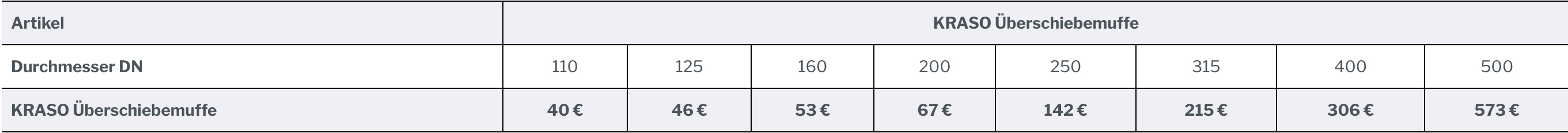Die KRASO Überschiebemuffe ist in den Durchmessern DN 110, 125, 160, 200, 250, 315, 400 und 500 verfügbar.