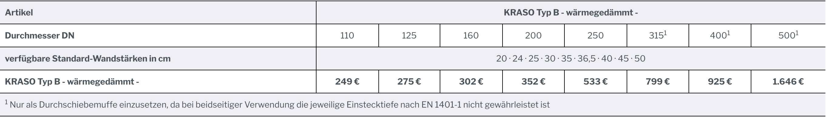 Die KRASO Wanddurchführung Typ B - wärmegedämmt - ist in DN 110 bis DN 500 erhältlich. Standard-Wandstärken liegen zwischen 20 cm und 50 cm. Abweichende Durchmesser und Wandstärken sind auf Anfrage möglich.