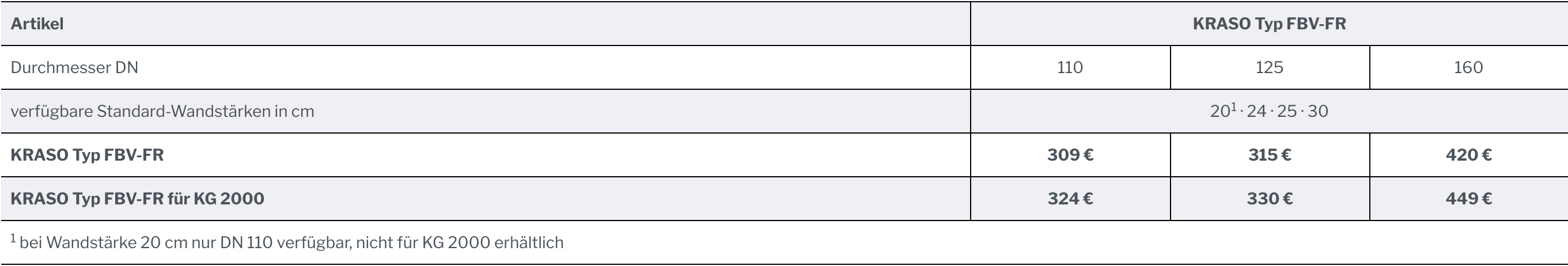 1 bei Wandstärke 20 cm nur DN 110 verfügbar, nicht für KG 2000 erhältlich |