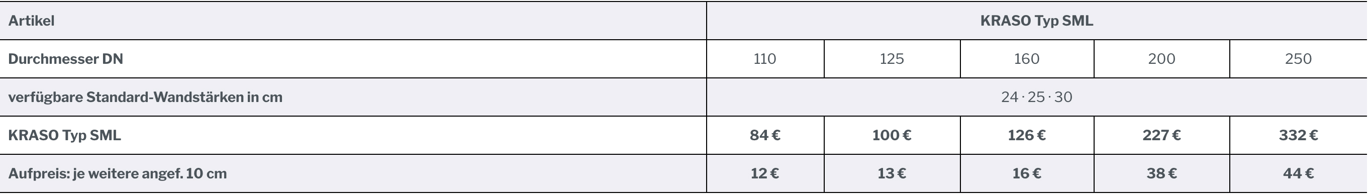 + KRASO Typ Universal D: mit integrierter Durchschiebemuffe+ Markierungen dienen zum einfachen Kürzen auf der Baustelle auf gängige Wandstärken+ Inklusive zwei KRASO Deckeln als Einbauhilfe!+ WU-Richtlinie: Beanspruchungsklasse 1 + 2