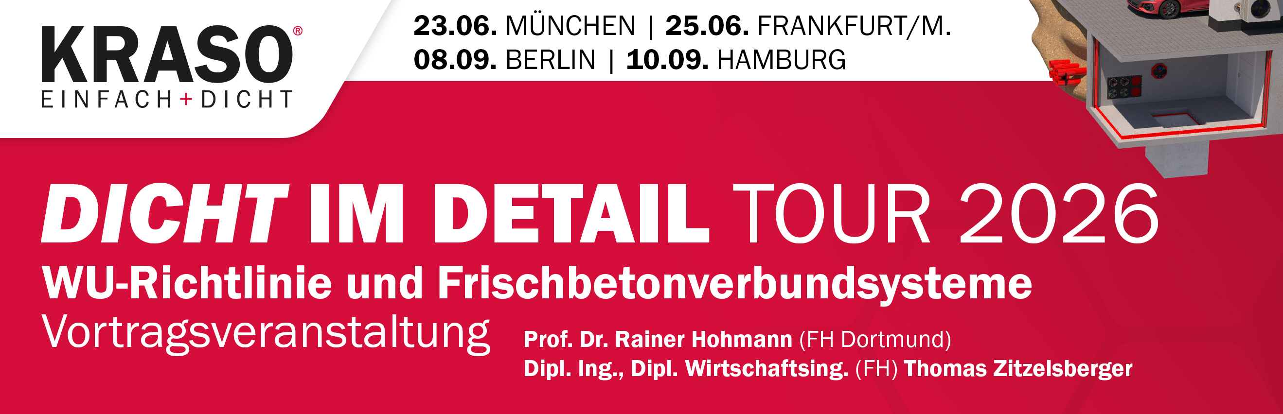 Ob Einfamilienhaus oder Industrieanlage – das Bauen mit wasserundurchlässigem Beton (WU-Beton) gehört zu den anspruchsvollsten Aufgaben im Hochbau. Um Feuchtigkeitsschäden zu vermeiden, zählt jedes Detail bereits in der Planung. Darum veranstaltet KRASO 2026 die bundesweite Vortragsreihe „DICHT IM DETAIL – WU-Richtlinie und Frischbetonverbundsysteme“.